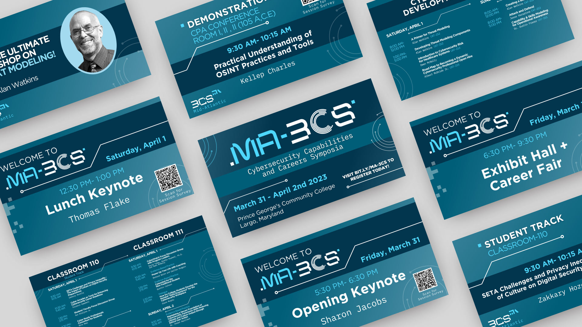 National Cyberwatch brought our team in to refresh the brand for their flagship event series, Cybersecurity Capabilities and Careers Symposia (3CS). The goal was to create one cohesive identity for the series with a clear structure that could adapt to different regions, starting with the inaugural Mid-Atlantic 3CS.